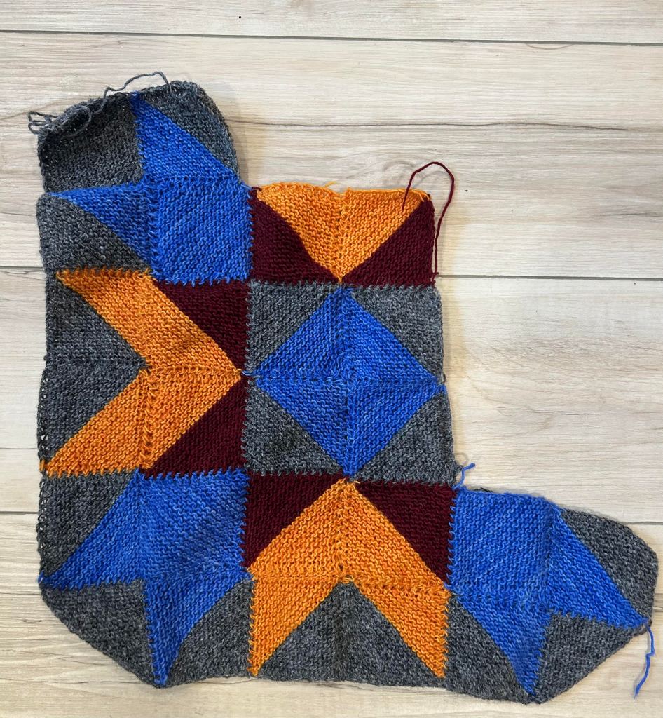 These are knit toe-up with what looks like a standard heel flap but if you’ve ever knit anything by Cat Bordhi, you know it’s not exactly standard. The gusset is knit with increases that make a V up the top of the foot, as you can see from the sock I knit for myself. Then you turn the heel and work the heel flap, attaching it to the stitches of the top of foot on either side of the V. It took me a bit to get that from the general formula, but I’ve got it now and will knit more socks this way. I knit the blue pair for my son-in-law and am very happy, after 2 rip backs, that I have a good looking sock. (The wool is Timberyarns, don’t you love the stripes? I do.)