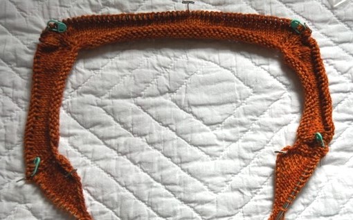 Once I knew I would have enough for the sleeves I could make a decision on the actual size of the rust stripe, knowing I could mimic it in the sleeves. I didn’t need all 18g for the body stripe I wanted so I ended up with a little left over. Then I knit the sleeve stripes, counting rows so they were the same as the body stripe. This worked out perfectly. At least I think it did.