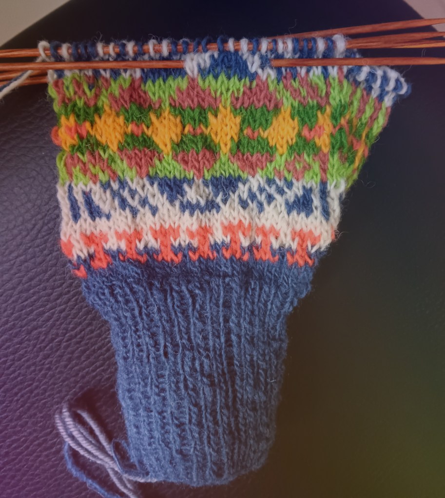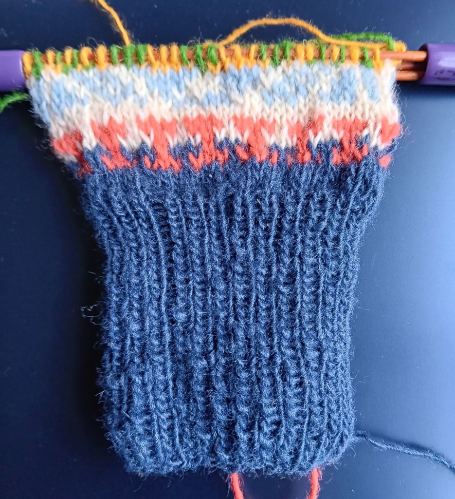 I finished the first of my pair of the Aert Mitts by Gudrun Johnston in Waxwing wool, a rustic fingering weight wool. Total enjoyed it but decided on the second one to reverse the centre section colours, just for fun.