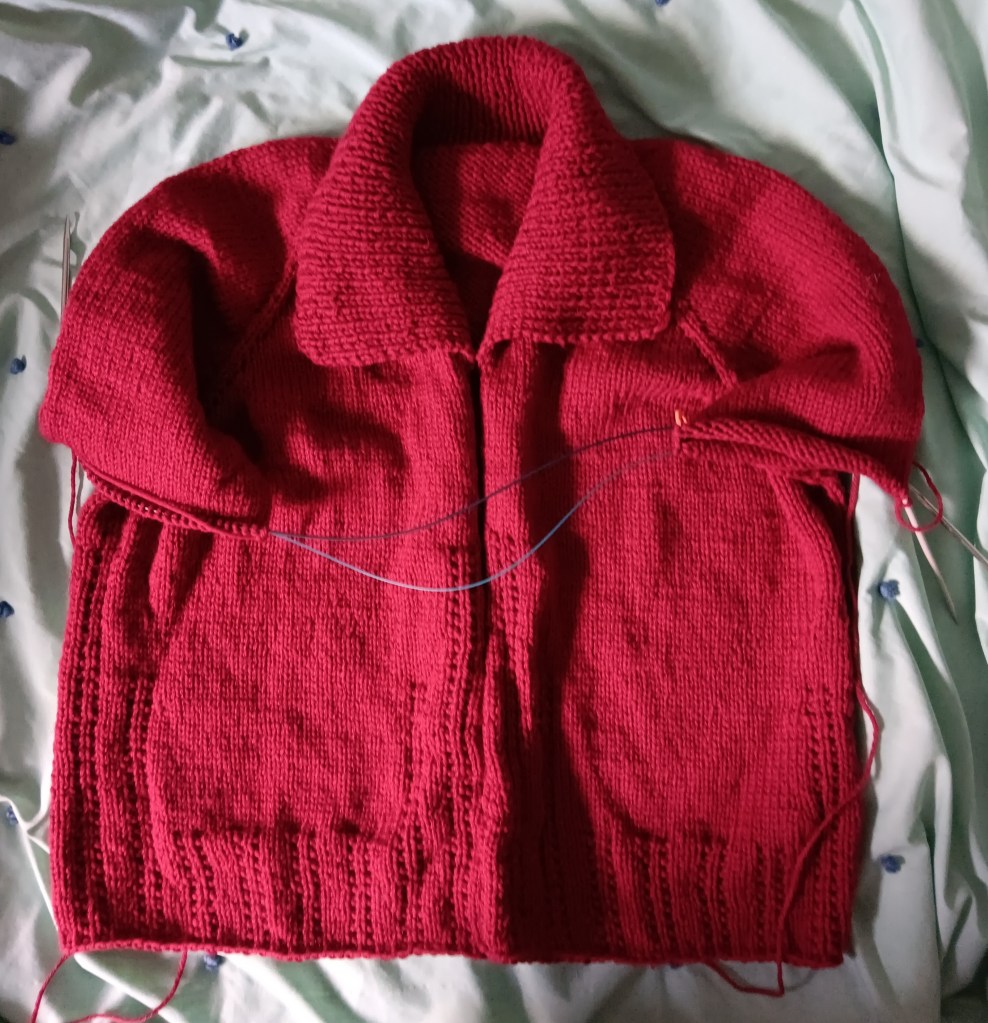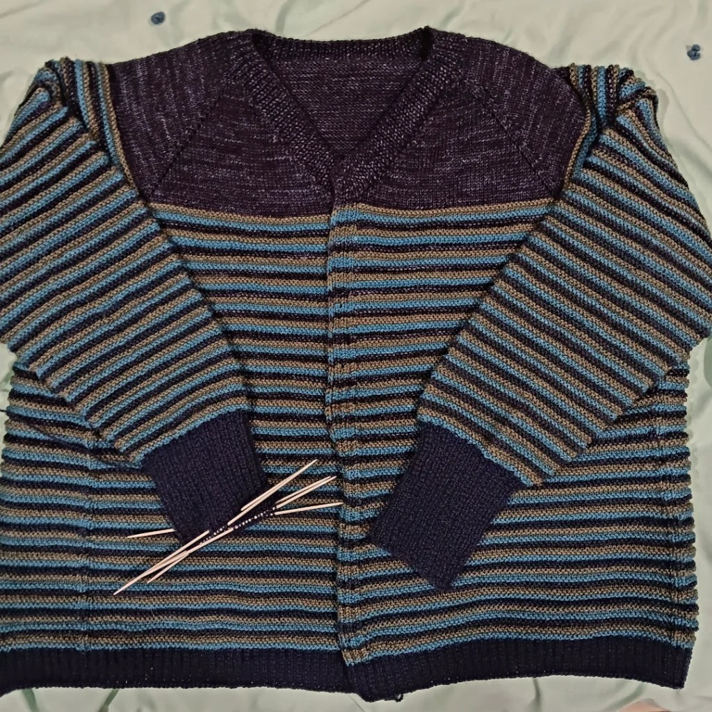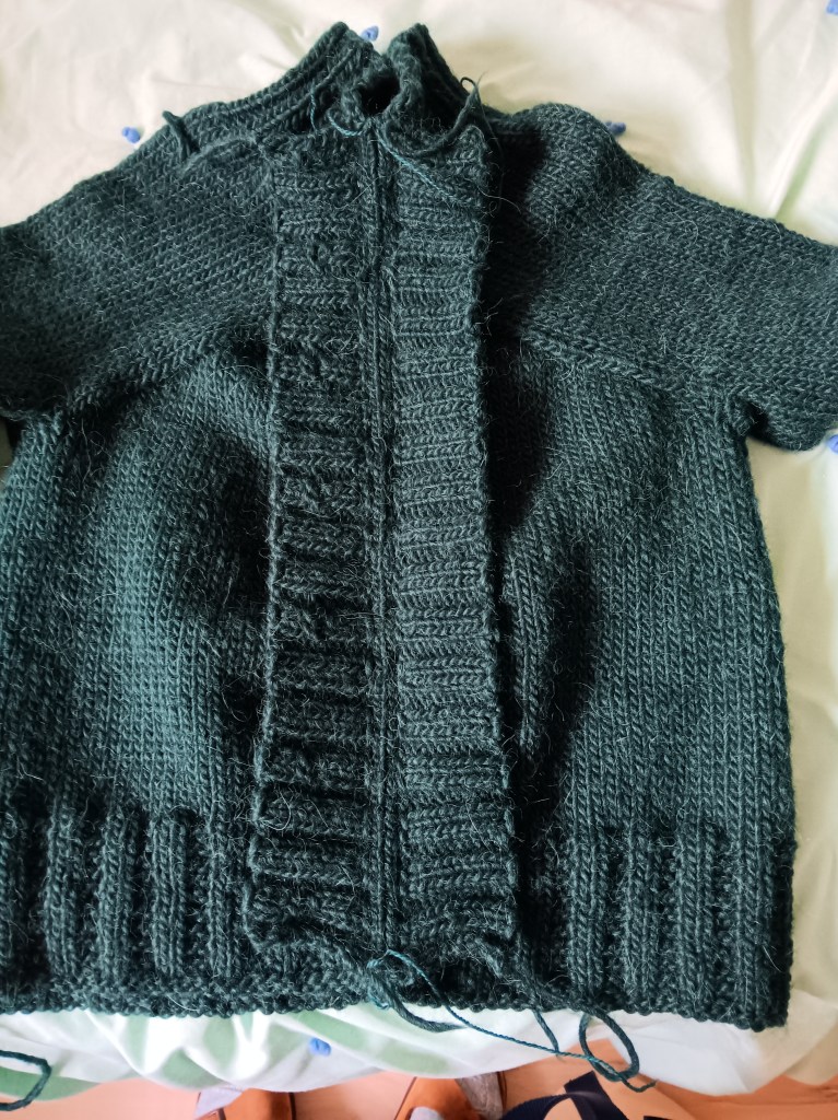 This is going to be called the Build A Better V, a baby/child sized garter stitch cardigan. It is a redo of the Build a V without the pointy bit at the bottom. I used left-over DK weight yarn (from the rainbow sweater). The extra bonus is that the different colours show the different parts of the cardigan. Four buttons to sew on and I’m done.