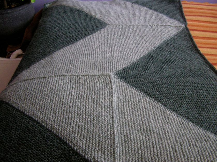 It’s a two colour wrap made with triangles that join-as-you-go. Triangle 1 begins on the left of the photo, in the Main Colour, with increases worked along the top edge. Work as far as you wish then change to the Contrast Colour for the bottom section of Triangle 1.