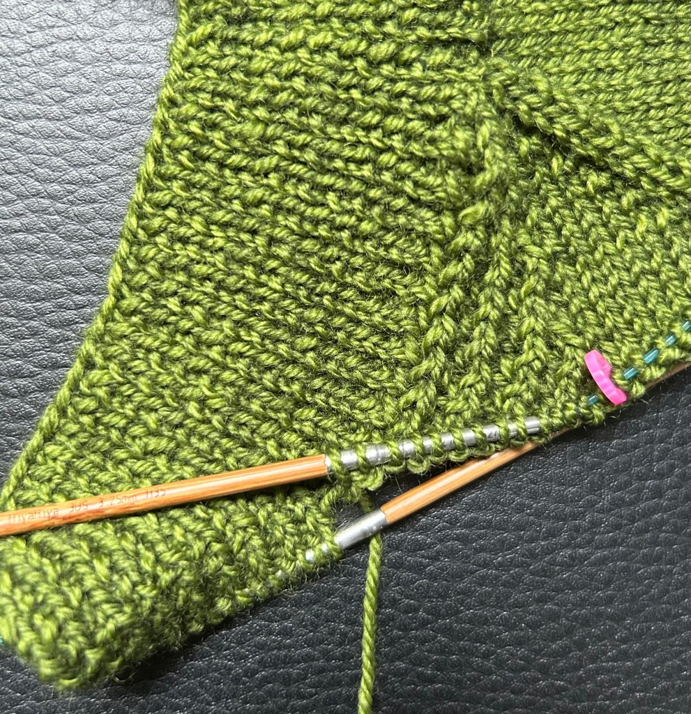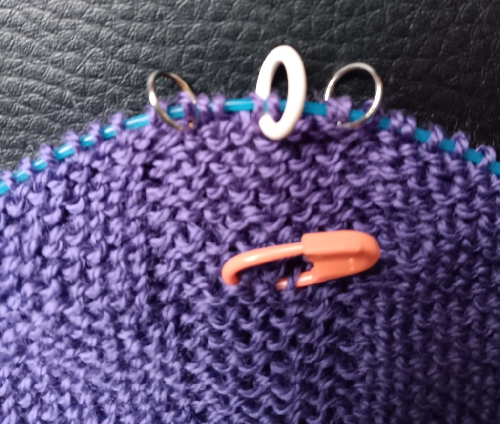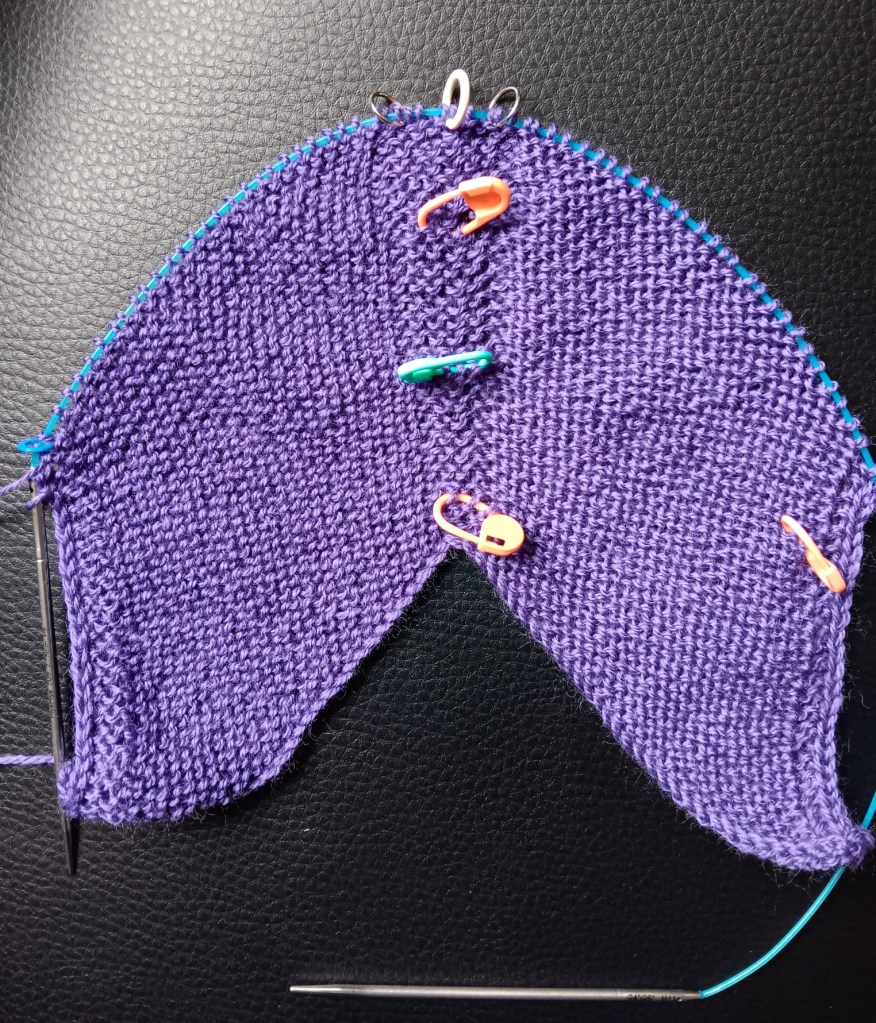 This is where things get exciting. You add two more markers so that you now have 4 sections to your shawl. Because you have also added 2 more markers where you will be working increases, the increases at the two side markers and centre marker are worked every 4th row.
