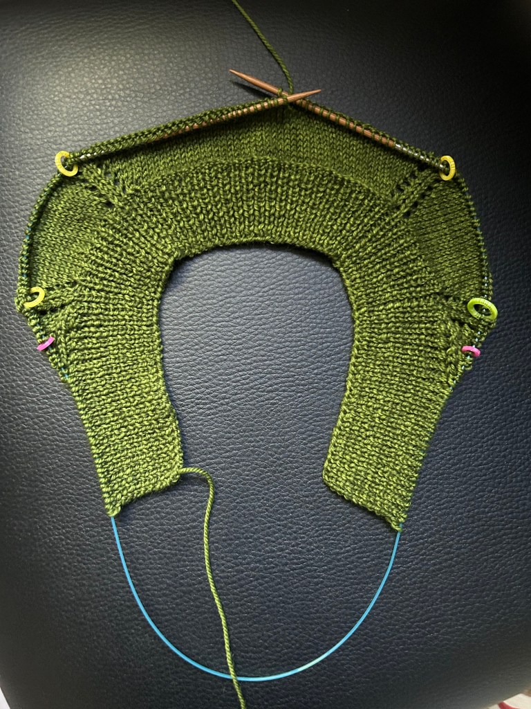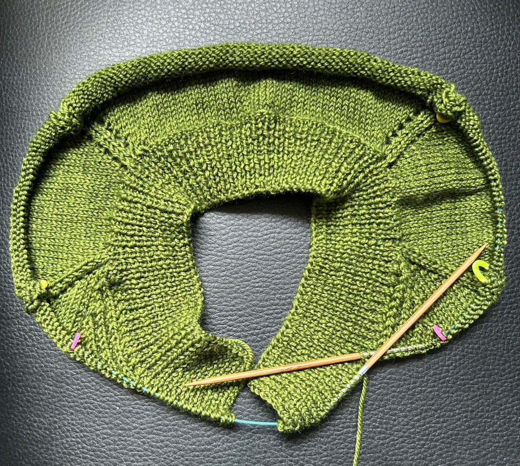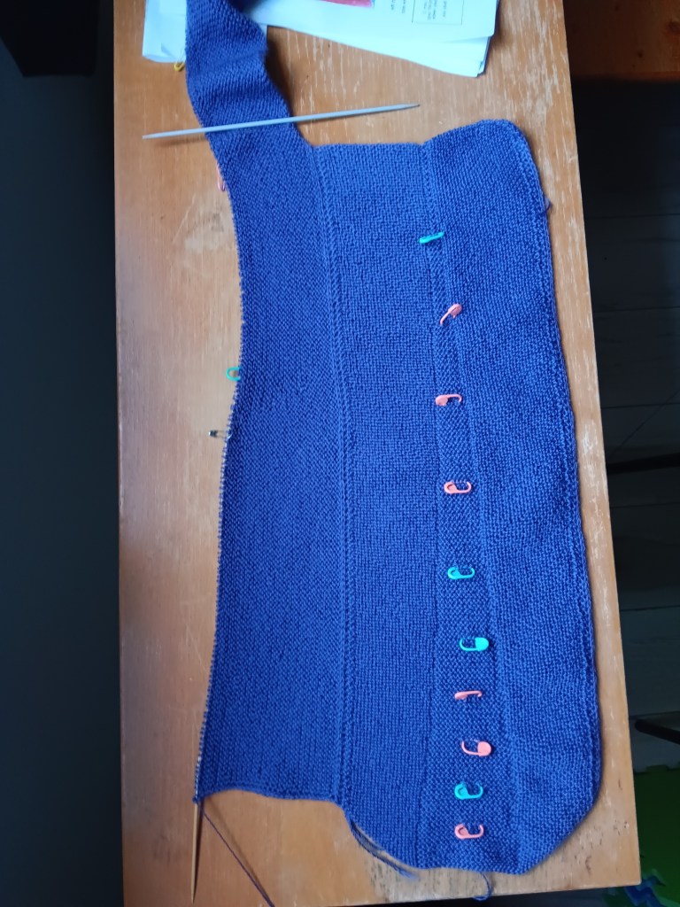 I’ve started my Tier Two section using the Eyelet pattern in garter stitch: one eyelet row and 3 knit rows.