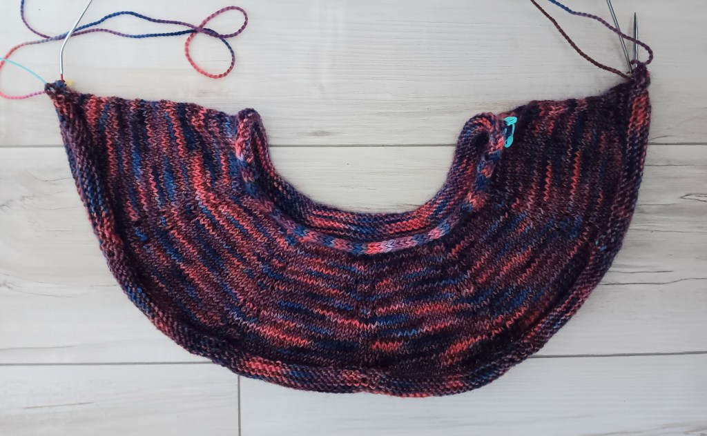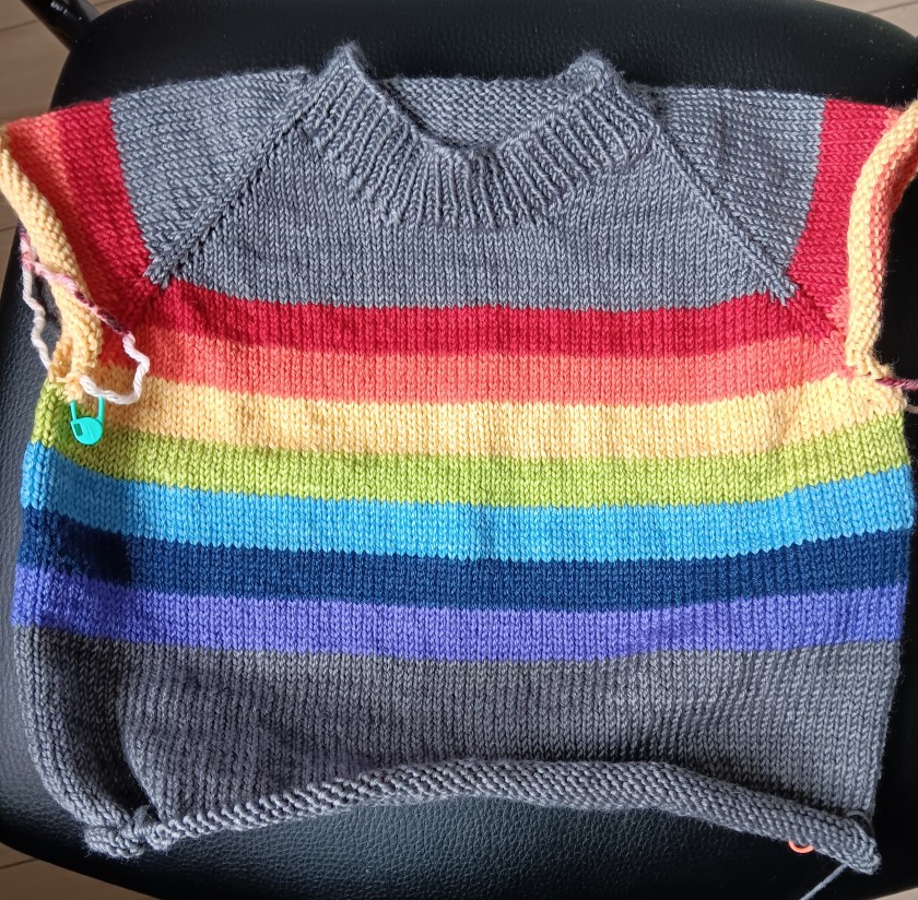 This is going to be called the Build A Better V, a baby/child sized garter stitch cardigan. It is a redo of the Build a V without the pointy bit at the bottom. I used left-over DK weight yarn (from the rainbow sweater). The extra bonus is that the different colours show the different parts of the cardigan. Four buttons to sew on and I’m done.